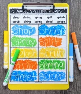 7–Scribble Spelling Many students love to color and create works of art. With this activity, you can choose to do it on blank paper and have the students use a black marker to make their design first, OR you can use this premade Scribble Spelling activity from our Editable Spelling Bundle!