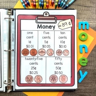 - Reference page with value (one cent, five cents…) and amount written with a dollar sign and cent symbol for penny, nickel, dime, quarter, and half dollar