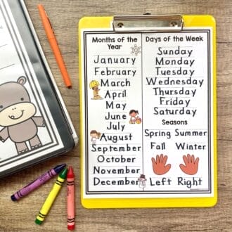 - Months of the Year, Days of the Week, Left/Right, Seasons Reference Page (3 – each with different skin tone hands)