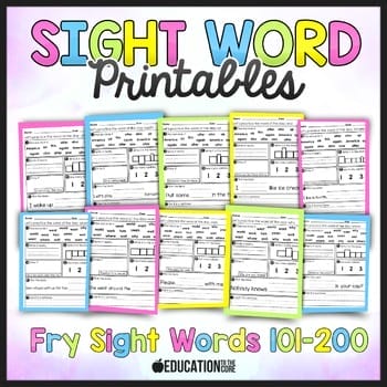 This FRY Sight Words Bundled Printable set contains printable activities for the second 100 sight words. (101-200) These can be used for whole/small group instruction, guided practice, or independent practice. In this pack, you will find the first twenty sight words with 7 activities on each page.