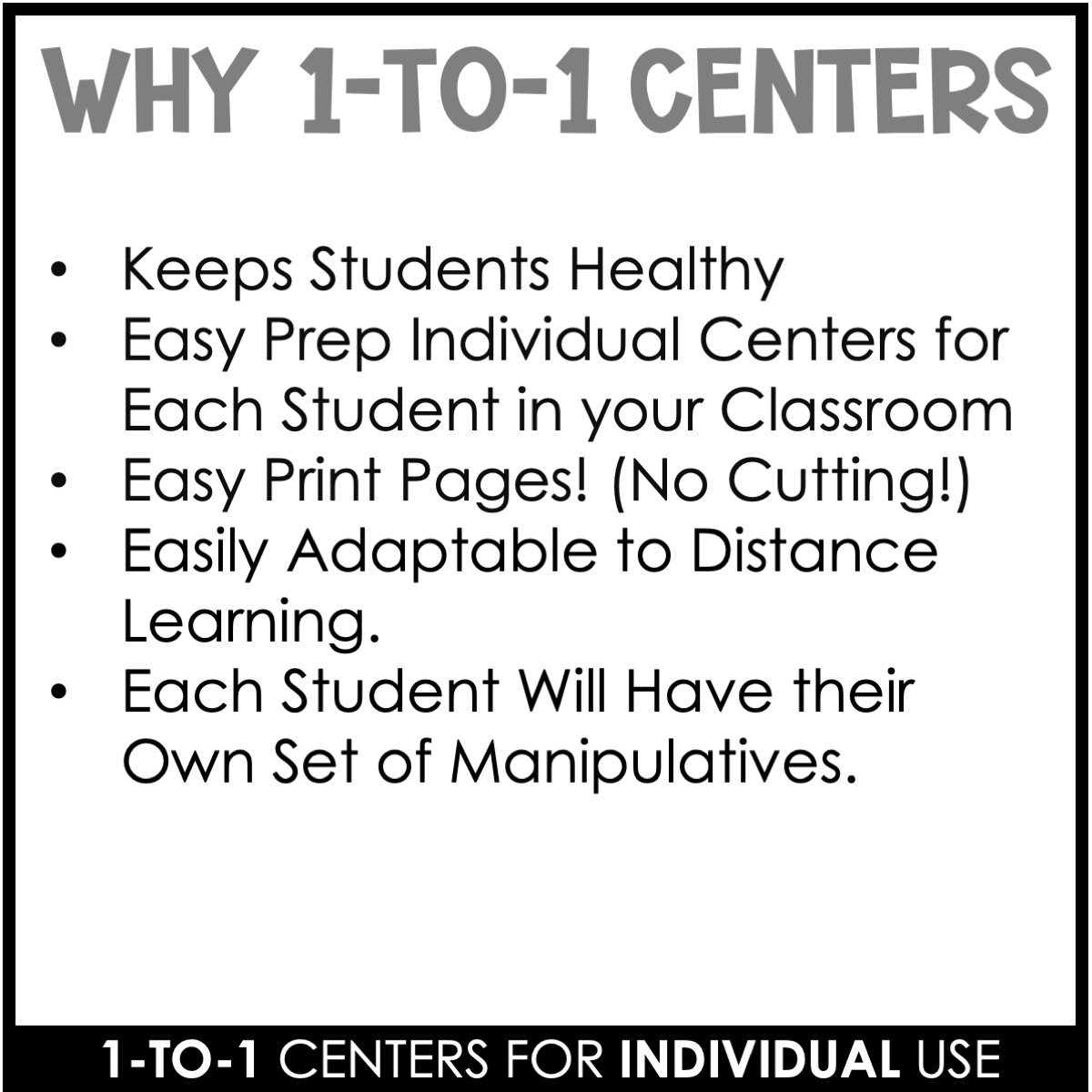 Feeling uneasy about prepping for next year? Whether you are in the classroom or are teaching virtually, these 1:1 Counters Centers will come in handy! Each student will have his/her set of counters and mats, and they are good to go! No cutting sets of games/centers for each student! Engage your students at school and/or at home with our 1:1 centers!