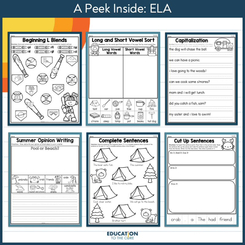 Students will review essential ELA, Math, Science, and Social Studies skills with these 70+ fun summer-themed worksheets!